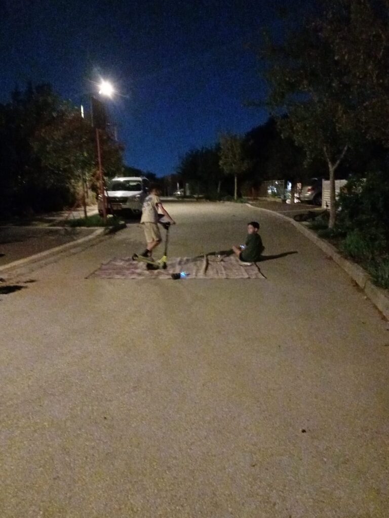 בתמונה – מיכאל ודניאל על המחצלת, בארוחת הרחוב.
