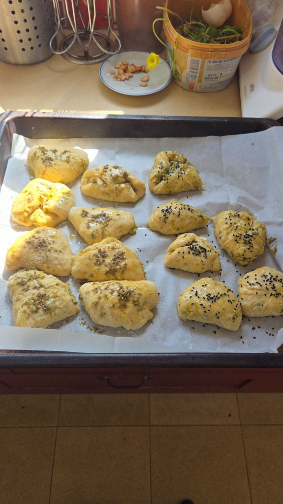 כשהבצק הכפיל את גודלו פרשתי נייר אפייה על האי במטבח, בזקתי עליו קמח ושיטחתי את הבצק כך שיישאר עבה יחסית, והמילוי לא יברח ממנו. קרצתי ממנו עיגולים עם תחתית של כוס זכוכית רחבה. ואז נזכרתי בגבינה 'מעודנת' שיש לי במקרר, מין גבינה כמו בולגרית אבל עדינה ממנה, שקניתי בסופרמרקט של משפחת אמון לפני מספר ימים. אז חתכתי ממנה קוביות קטנטנות. בכל עיגול שמתי קוביית גבינה וחצי כפית מילוי תרד, חמציצים ואגוזים, ואז סגרתי את הבצק באצבעות, חלק כמו אזני המן וחלק כמו סהרונים.